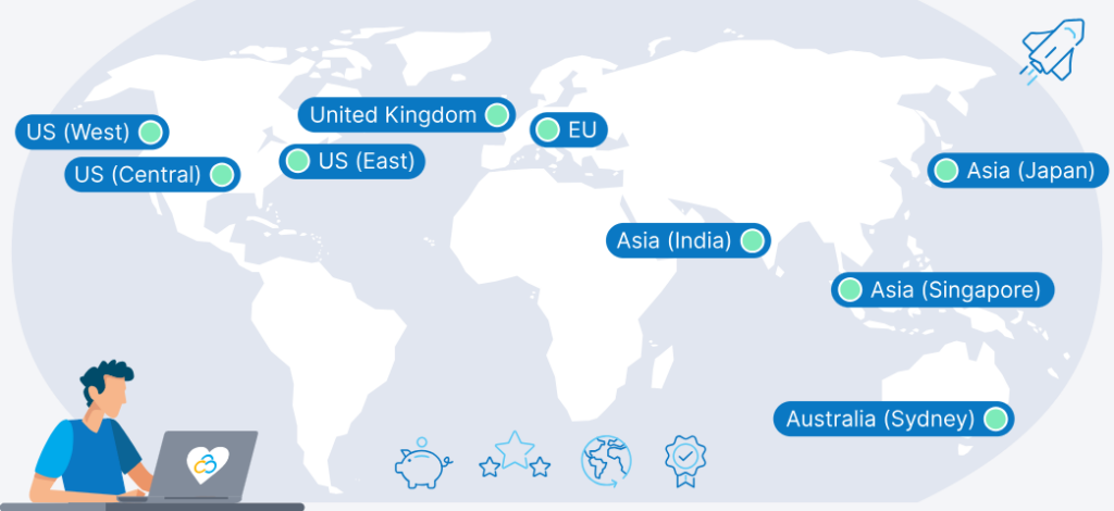From the USA to the UK, from Europe to Asia and Australia, choose your ideal hosting location for low latency worldwide